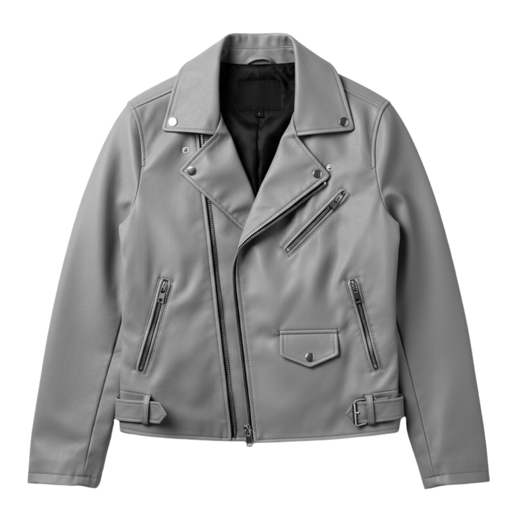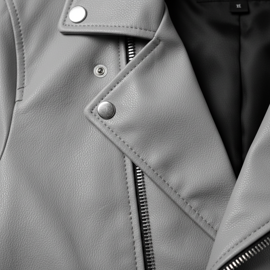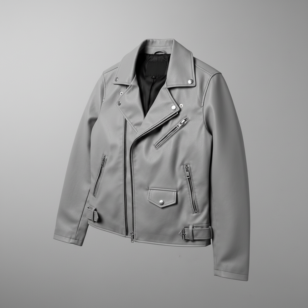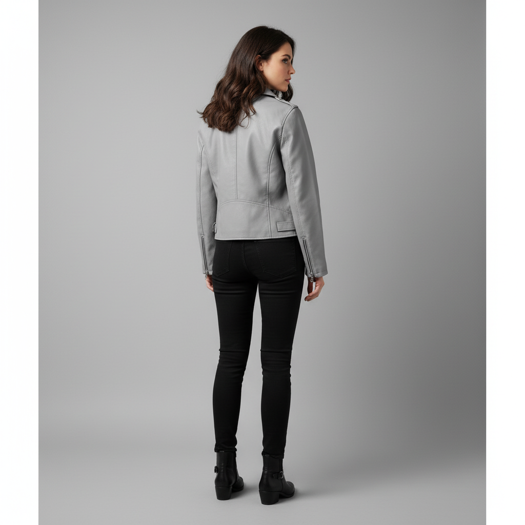 In-Depth Details Chaque fibre de ce simili-cuir mat gris clair a été sélectionnée pour sa tenue impeccable et son toucher soyeux, qui rivalise avec les cuirs les plus fins. Observez la fluidité des lignes de la fermeture éclair asymétrique, conçue pour glisser sans accroc, année après année, défiant les faiblesses des imitations rudimentaires. C’est l’harmonie de ces détails, la précision de chaque couture, la qualité de la doublure intérieure noire discrètement visible au col, qui élèvent ce blouson au rang d’investissement mode plutôt que de simple achat.