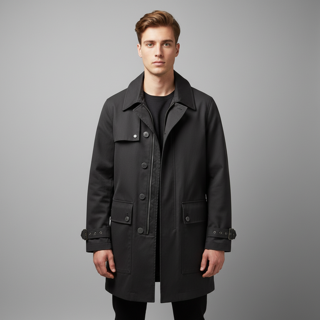- Grandes poches plaquées à rabat : Proposent un espace de rangement généreux et sécurisé, gardant vos essentiels à portée de main et protégés des intempéries, sans jamais nuire à l’esthétique épurée du manteau.